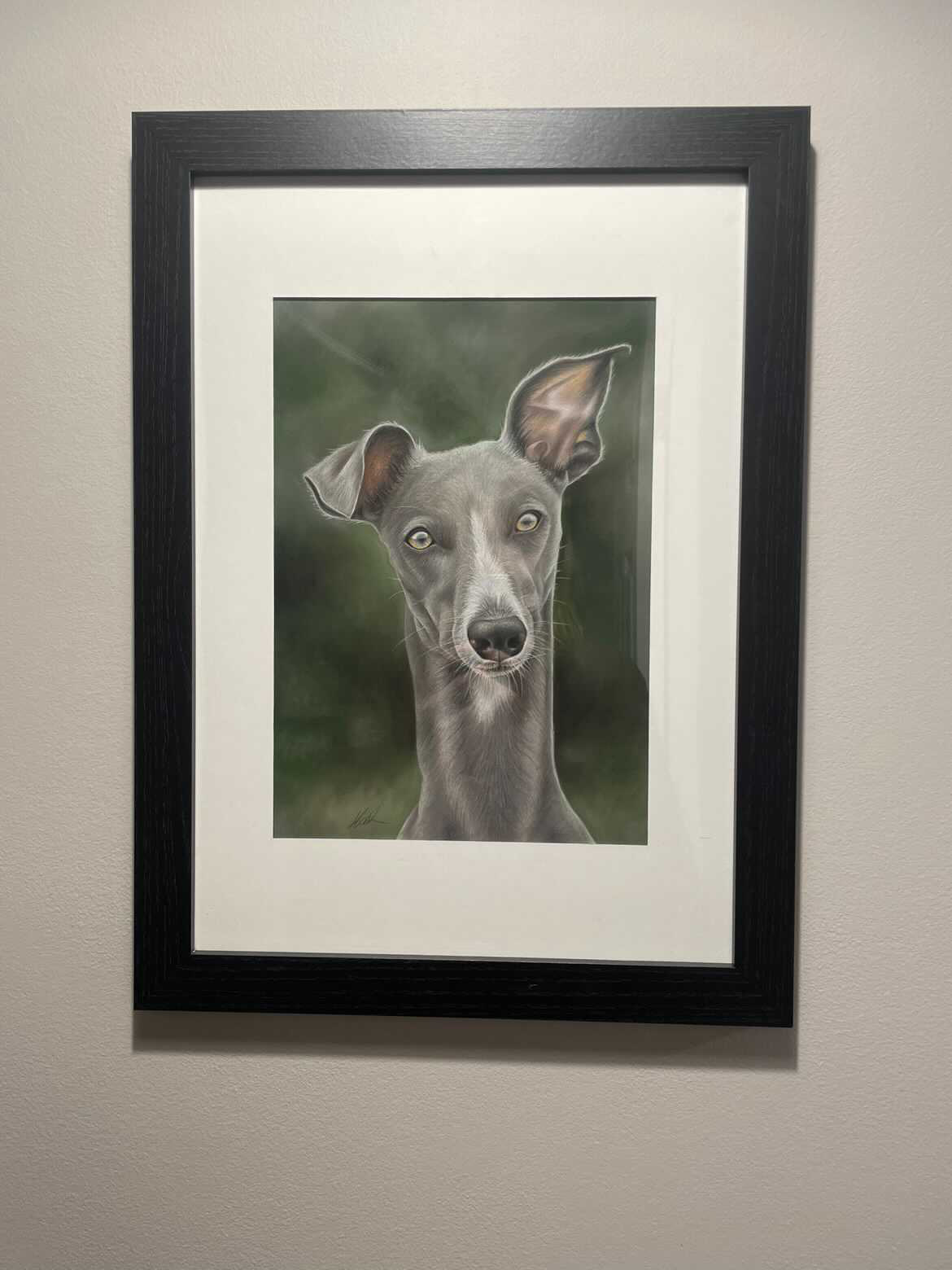 I first found out about Hannah around a year ago after seeing some of her pet portraits on Instagram and I put myself straight on the waiting list and it was so worth the wait! Hannah has recently finished the portrait of my whippet and it is exactly what I asked for and more. Once the portrait was complete it was promptly sent out and I received it very quickly along with the certificate of authentication. I would 100% recommend Hannah if you were looking to commission a portrait of your pet, she is not just talented but so friendly and helpful with excellent customer service